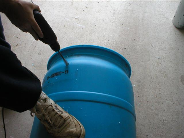 Drill a pilot hole in the side of the barrel at the top. The hold should be big enough to accommodate your Jigsaw/Sawsall blade.
