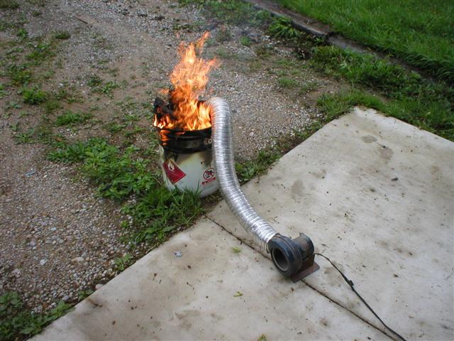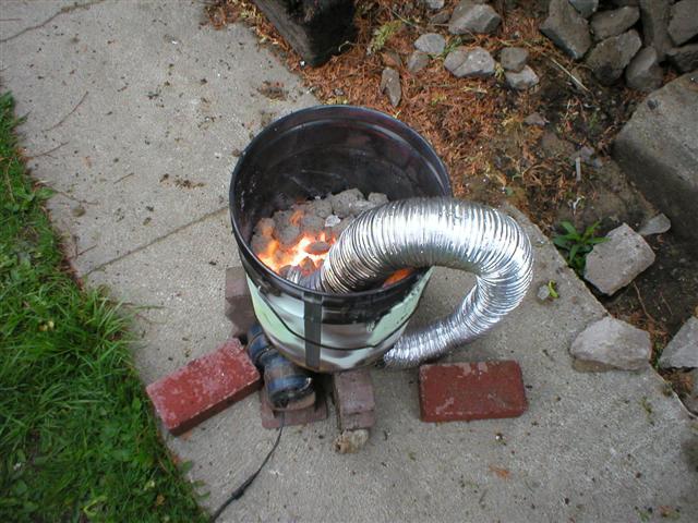 Pour the Briquettes in the bucket and light on fire. To gain extra heat, I added a small squirrel cage fan to blow